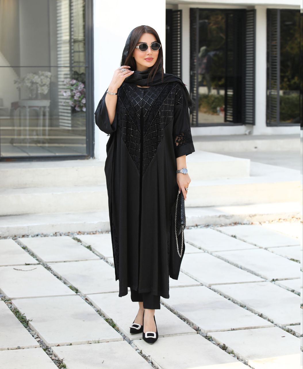 جنس کار کرپ شاین فری سایز مناسب ۳۸ تا ۵۸ تک رنگ مشکی ترکیب با خرجکار هندی و گیپور و سنگ دوزی پشت کار گیپور خورده قد کار ۱۲۰